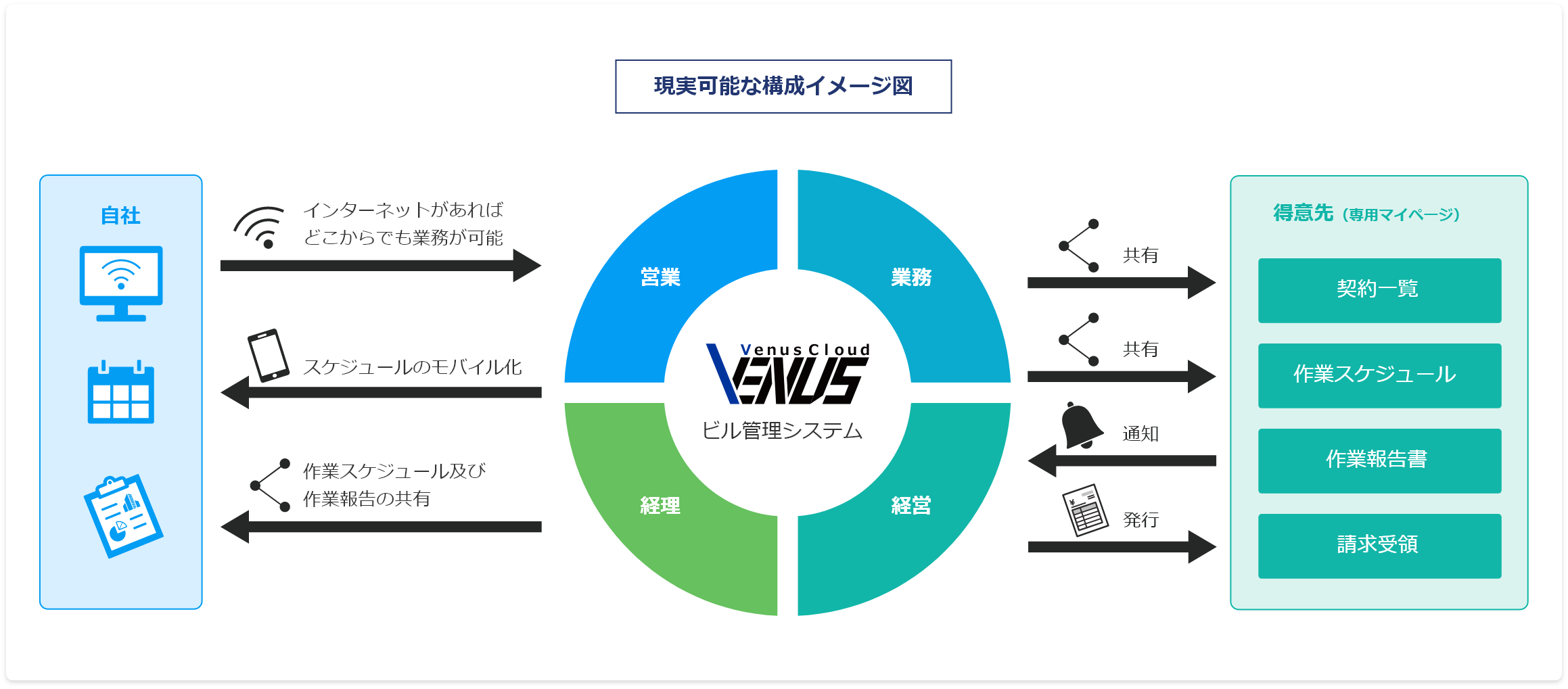 Venus Cloudはクラウドシステムだから、社内の各部署業務の情報共有はもちろん